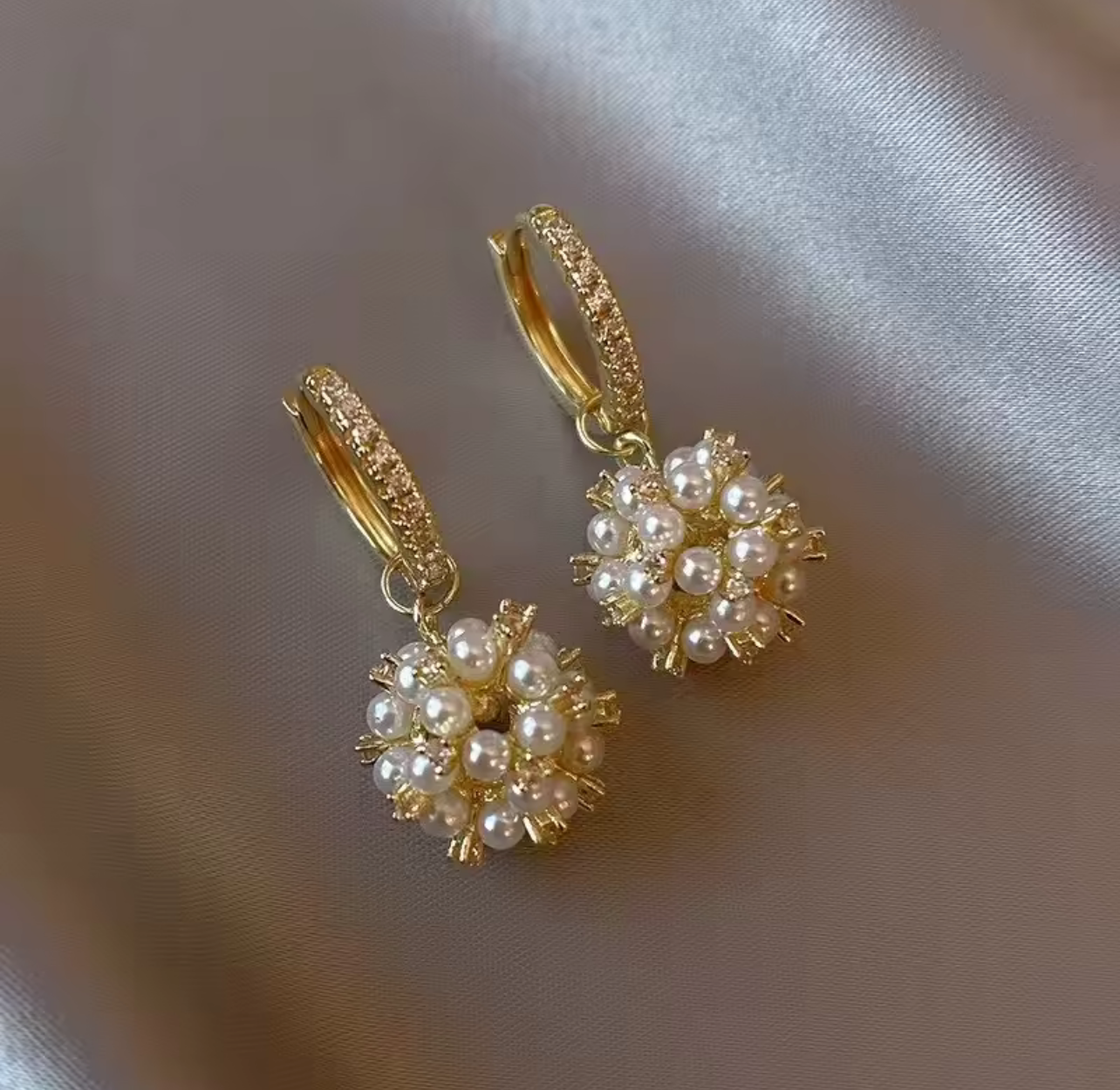 Softly radiant and feminine. The Bloom Drops feature delicate clusters of pearls framed in gold — a modern take on timeless elegance. Perfect for adding subtle sophistication to any outfit, from casual coffee days to evening moments.
